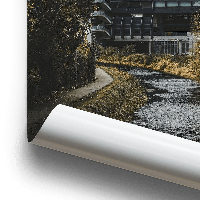 Een rustig waterkanaal slingert richting een imposante stadionconstructie, omringd door herfstbomen in warme gele tinten. Het contrast tussen natuur en staal zorgt voor een gebalanceerde compositie waarin rust en monumentaliteit samenkomen.