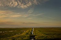 Een warm avondlicht beschijnt het landschap van de kwelders van de Groninger Waddenkust. Een stil en ruim landschap in Noord-Groningen.
