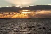 windmolens en ondergaande zon over het water een typisch Nederlands beeld. met zonnestralen in strepen door de wolken.