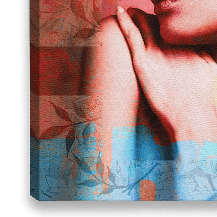 Portret van een jong vrouw in een tijdloze houding gecombineerd met vintage kunst en een color pop zodat het een beeld van nu wordt. Vrouw met mooie lijnen, prachtige handen en ogen en mooie zwarte haren. Ze kijkt je niet aan, wat het beeld ook weer heel spannend maakt.