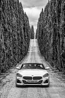 Een zwart/wit foto van een BMW Z4 staand tussen in cipressenlaan in de regio Toscane in Italie. De ideale auto om in het mooie en zonnige Toscane te verkennen.