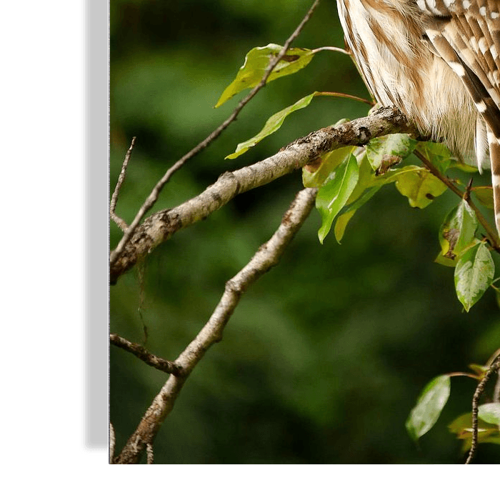 Noorderlijk gevlekte bosuil op een boomtak in het bos. Prachtige trendy groen en bruin tinten van de bladeren en de veren van de uil. De uil kijkt je recht in de ogen. Natuur op z'n mooist.
