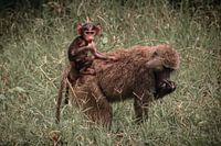 Aan de oevers van Lake Manyara zit een jonge baviaan relaxt op de rug van zijn moeder tussen zijn tanden te frommelen.