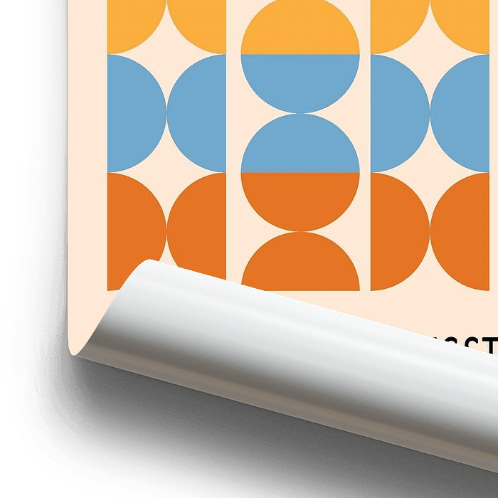 Mooie kleurrijke Bauhaus poster met verschillende ronde vormen. In de kleuren, Oranje, blauw, geel en zwart.