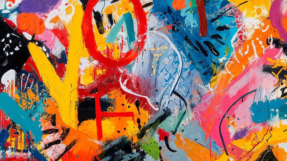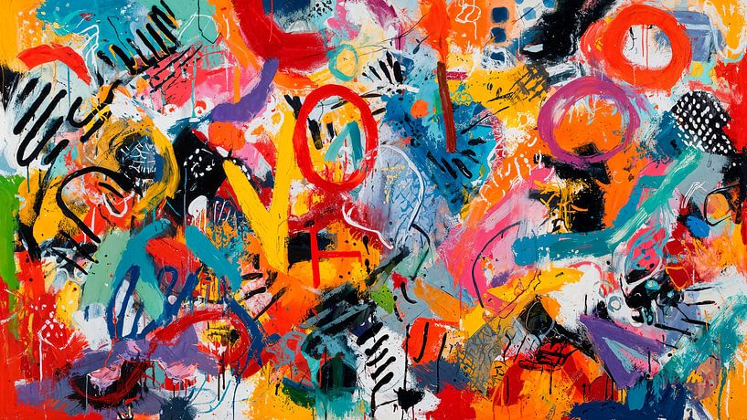 Een modern abstract kunstwerk vol levendige kleuren en dynamische vormen, de achtergrond is een mix van gestructureerde penseelstreken en kleurspatten wat een gevoel van beweging en energie creëert. De stijl is