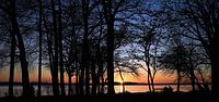 Een rustig moment aan de Chiemsee, waar de ondergaande zon het landschapspanorama baadt in zacht oranje en diep blauw. Donkere, tere bomen staan op de voorgrond, hun silhouetten omlijsten het uitzicht op de horizon en het meer. Het laatste licht van de dag glinstert door de boomtoppen en wordt zachtjes weerkaatst op het kalme oppervlak…