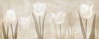 Beige Tulpen Schilderij - Dit tulpen schilderij toont een elegante reeks van witte tulpen op een neutrale, beige achtergrond. De bloemen zijn gestileerd en eenvoudig, bijna monochromatisch, met een focus op subtiele textuurdetails die de contouren van elk bloemblad en elke steel benadrukken. Dit geeft de illusie van diepte en zachtheid…