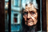 In dit krachtige close-up portret kijkt een oudere vrouw door een raam bedekt met regendruppels. Haar doorleefde huid is doorkruist met diepe rimpels die elk jaar van haar leven weerspiegelen. Haar blik is peinzend en bedachtzaam, alsof ze naar buiten kijkt in de regen, op zoek naar iets of misschien verdwaald in…