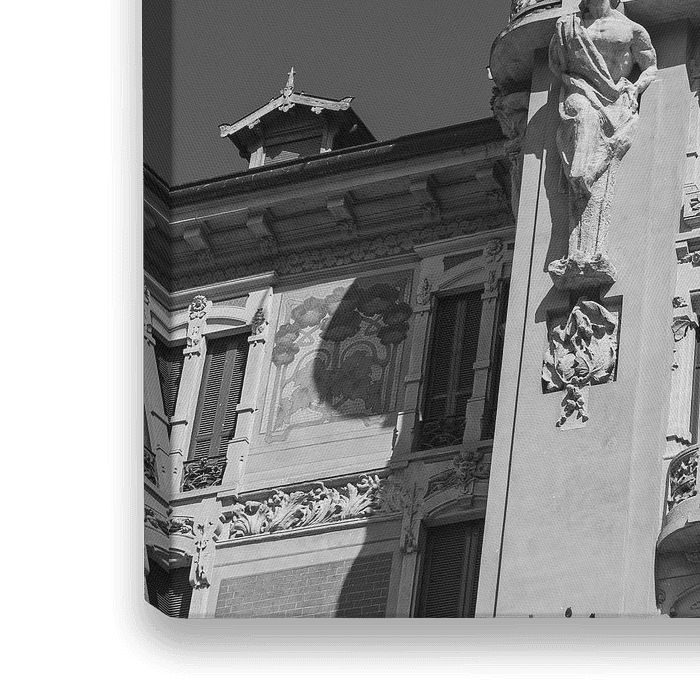 Het Grand Hotel in San Pellegrino Terme, vlakbij Bergamo in Lombardije, Italië, weerspiegelt de tijdloze elegantie van de Belle Epoque-architectuur. De prachtige gevel van dit sierlijke gebouw bevat ingewikkelde architectonische details, waaronder beelden en decoratieve elementen rond de ramen. Het is een architectonisch juweel uit de Belle Epoque periode. Hier vastgelegd in zwart-wit, met nadruk op het contrast en de texturen van de sierlijke structuur.