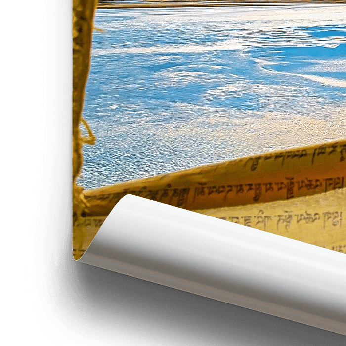Leuk doorkijkje, dat de sfeer van het landschap goed weergeeft. Overal in Tibet vind je de gebedsvlaggetjes, waarop gebeden zijn afgedrukt. Deze gebeden worden meegenomen door de wind. Het licht valt mooi op het water, zodat het schittert.