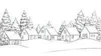 Deze gedetailleerde zwart-wittekening toont een rustig dorpje in een besneeuwd bos. Kleine, gezellige huisjes met rokende schoorstenen staan tussen majestueuze, besneeuwde pijnbomen. De dikke sneeuwlaag bedekt zachtjes de daken en het omringende landschap, terwijl de rook uit de schoorstenen een warme, uitnodigende sfeer creëert. Het…