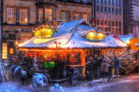 Over ‘Besneeuwde glühweinkraam op de kerstmarkt bij Abendd�mmerung, Bremen, Duitsland’ van Torsten Krüger