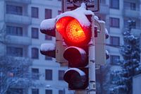 Besneeuwde verkeerslichten op rood