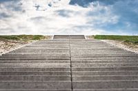 Stairway to heaven. Gecultiveerde Nederlands landschap met omhooglopende traptreden. Hollandse zeedijk met groen gras en stapelwolken . Architectuur vormen in het landschap met strakke lijnen en perspectieven.