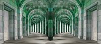 De foto toont een symmetrische structuur met een reeks bogen die tot in de diepte reiken. De bogen zijn gemaakt van groengrijze tegels of stenen die een geometrisch patroon vormen. Een centrale zuil of pilaar lijkt in het midden te staan, wat de symmetrische opstelling benadrukt. De afbeelding geeft de indruk van een lange, gewelfde…