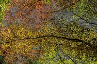 Jong blad van verschillende beuken. De blaadjes zijn nog doorschijnend en lichten op door de zon. De bomen hebben verschillende kleuren. De blauwe lucht is van kleur verandert door nabewerking.