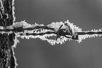 Bevroren prikkeldraad bedekt met een vroege ochtend vorst, waardoor een abstracte foto in hoogcontrast zwart-wit ontstaat.