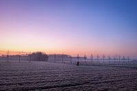 Een bevroren veld in het licht van de opkomende zon op een winterochtend. Op deze weide in Kiewit, Hasselt (België) vind elk jaar het Pukkelpop festival plaats, maar voor de rest van het jaar is het een gewone grasweide.