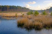 Een bevroren ven en vijver in natuurgebied De Teut in Zonhoven, België onder en licht bewolkte lucht met dennebomen op de achtergrond.