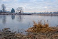 Een bevroren vijver onder een bewolkte hemel op een koude winter ochtend op natuurreservaat De Teut in Zonhoven (België).