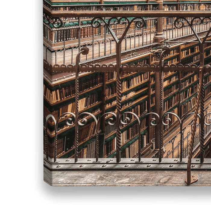 Een ruimte met mooie rustige kleuren waar een symmetrisch lijnenspel de hal met boeken weergeeft in de bibliotheek van het rijksmuseum in Amsterdam Nederland. Een plek wat rust uitstraalt, heel veel boeken wat door het standpunt diepte geeft.