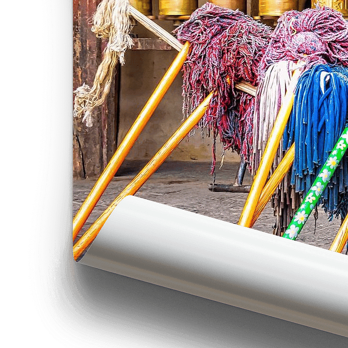 Bid en werk, (ora et labora) daar moest ik aan denken bij het maken van deze foto, in een klooster in Tibet. De gebedsmolens draaien (links). In de molen zit een rol papier met daarop een mantra, meestal is dat een zegenwens voor alle levende wezens. Door de molen een zetje te geven worden de wensen het universum in gestuurd. Maar gewerkt wordt er ook getuige de zwabbers en ladders.