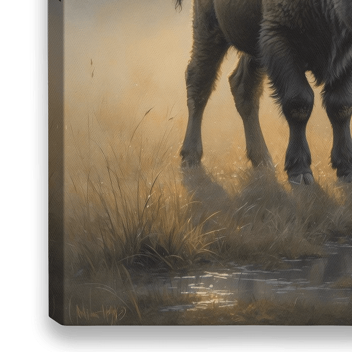 Dit werk toont een jonge bizon in het vroege ochtendlicht, staand in een open landschap waar mist en zonlicht elkaar voorzichtig ontmoeten. De lucht gloeit zacht, het land is stil, alsof de wereld nog niet besloten heeft te bewegen. Alles in deze compositie ademt rust, ruimte en het begin van draagkracht.