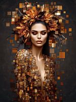 Fantasie portret van een mooie vrouw met bloemen in haar bruine haar en gekleed in bruin gouden kubussen. Haar hoofd en lichaam zijn versierd met veel kleine vierkante blokjes die een ingewikkeld patroon op elkaar vormen.