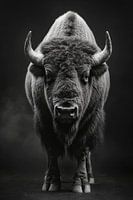 De krachtige figuur van een buffel rijst trots en majestueus op, zijn machtige hoorns stralen innerlijke kracht uit. In expressief zwart-wit legt de afbeelding de rauwe, ongetemde essentie van de natuur vast. Dit kunstwerk past perfect in een woonkamer of kantoor, waar het fungeert als een krachtig statement en conversatiestarter.