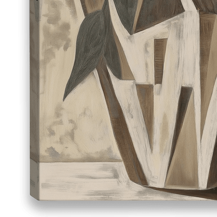 Een spel van vormen en kleuren staat centraal in dit abstracte werk met bladmotief. De herkenbare contouren van een blad zijn gestileerd en ingebed in een compositie van zachte aardetinten zoals olijfgroen, zandkleur en terracotta. Het werk ademt rust en eenvoud, mede door de vloeiende lijnen en het ontbreken van scherpe contrasten. De…