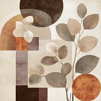 Bladeren Abstract - Dit is een botanisch schilderij met bladeren die elegant uitkomen tegen een achtergrond van abstracte vormen in aardetinten, wat het geheel een moderne en serene uitstraling geeft.