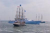 modern Oorlogschip de Zeeland kruist voor een zeilschip langs die deelneemt aan de Sail 2013