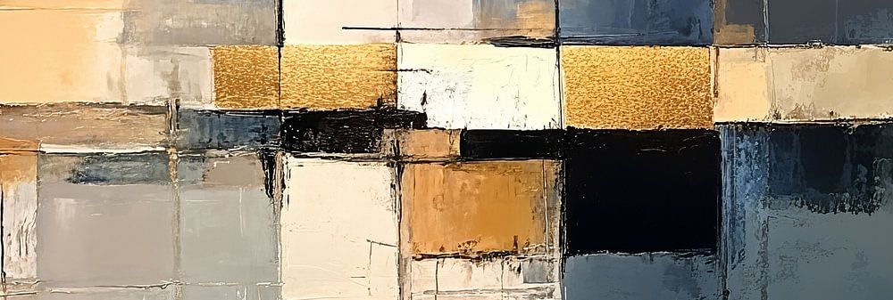 Blauw Abstract - Dit abstract schilderij toont een kalme compositie van overlappende blokken en lijnen in tinten blauw, goud, zwart en wit, die een serene en meditatieve ervaring oproepen.