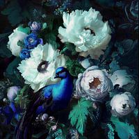 Midden in een weelderige compositie van bloemen en diepe tinten blauw, rust een majestueuze vogel met een glanzend, kobaltblauw verenkleed. De bloemen, een mengeling van witte en blauwe pioenrozen en anemonen, lijken haast licht te geven tegen de donkere achtergrond, waardoor het geheel een mystieke en betoverende sfeer krijgt. De…