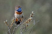 Blauwborst / Blauwborst (Luscinia svecica) volwassen witgevlekte mannetjes, neergestreken op duindoorn, kijken, territoriaal gedrag, wild, Europa.