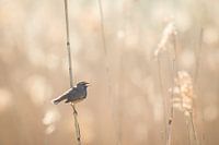 Een mannelijke blauwborst zingt in het riet tijdens zonsopkomst