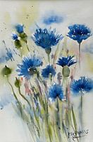 Deze aquarel straalt een gevoel van lichtheid en spontaniteit uit. Op de voorgrond zien we een groep korenbloemen, herkenbaar aan hun karakteristieke blauwe tinten en speelse bloemvormen. De kunstenaar heeft gekozen voor een losse, vloeiende penseelvoering, waardoor de bloemen lijken te dansen op het papier.