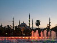 Sultan Ahmed Moskee of Blauwe Moskee of Sultan Ahmet Camii in het Turks in Istanbul Turkije. Avondzicht vanuit het park met een kleurrijke fontein op de voorgrond.