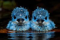 Ontdek de serene schoonheid van twee blauwe vogels, bedekt met glinsterende ochtenddruppels, in deze adembenemende foto. Perfect voor een vleugje natuur in je slaapkamer of keuken.