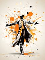 Het levendige schilderij toont een kleurrijke beige en oranje achtergrond met speelse verfspatten die als vuurwerk over het doek lijken te exploderen. In het centrum staat een trotse, donkere man met zijn armen wijd open, als een baken van kracht en zelfverzekerdheid.