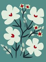 Charmante bloemen tegen een effen, blauwgroene achtergrond. De bloemen zijn wit met rode hartjes en zwarte stelen, wat zorgt voor een sterk contrast dat de bloemen doet opvallen. De compositie is minimalistisch en gestileerd, met een nadruk op de vorm en kleur van de bloemen in plaats van op gedetailleerde texturen.