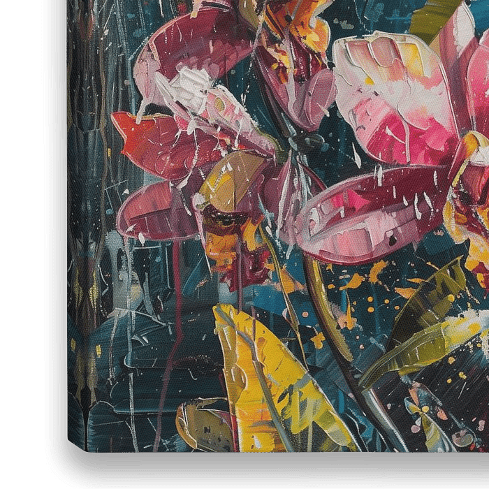 Dit werk toont een close-up van prachtige roze orchideeën tegen een kleurrijke achtergrond. De levendige kleuren van de bloemen en de gedetailleerde weergave van de bloemblaadjes brengen een gevoel van frisheid en elegantie over. De achtergrond, met zijn abstracte patronen en rijke tinten, zorgt voor een dynamische en levendige sfeer.…