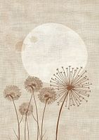 Bloemen Schilderij | Lunar Bloom Symphony - Dit minimalistische natuur schilderij toont vijf delicate bloemstillevens voor een grote maan. De bloemen, met lange, ranke stelen, tonen fijn vertakte bloeiwijzen, waarvan één bijzonder prominent in het midden staat, als een dynamische ster met veel dunne, uitstekende punten. De kleurstelling…
