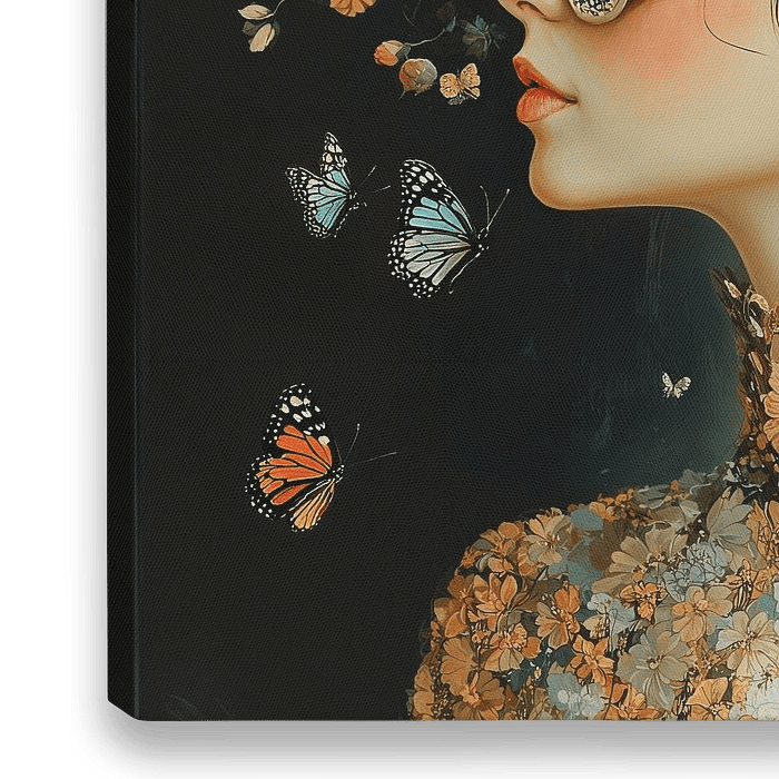 Bloemen en Vlinders - Op dit bloemenportret schilderij is een vrouw te zien wiens hoofd en schouders bedekt zijn met een weelderige verzameling van veelkleurige bloemen en fladderende vlinders, uitgebeeld in een realistische stijl met een vleugje surrealisme door het masker versierd met bloemmotieven.