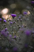 Close up van de smalle aster, met het licht van de opkomende zon op de achtergrond.