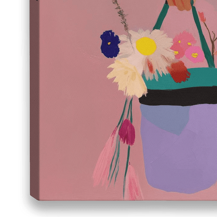 Een emmer vol met kleurrijke bloemen. Een eigentijdse illustratie die de schoonheid van een spontaan geplukt boeket veldbloemen vangt. Dit kunstwerk met zijn zachte roze achtergrond en expressieve details brengt een vleugje lente en zomer in elk interieur.
