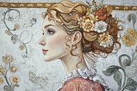 Bloemenportret | Klassieke Schoonheid in Bloei - Dit vrouwenportret schilderij toont een jonge vrouw met een dromerige blik, gedecoreerd met een weelderige bloemenkroon in haar opgestoken haar, gestyled tegen een achtergrond van fijne florale motieven die een zachte rococo-invloed uitstralen.