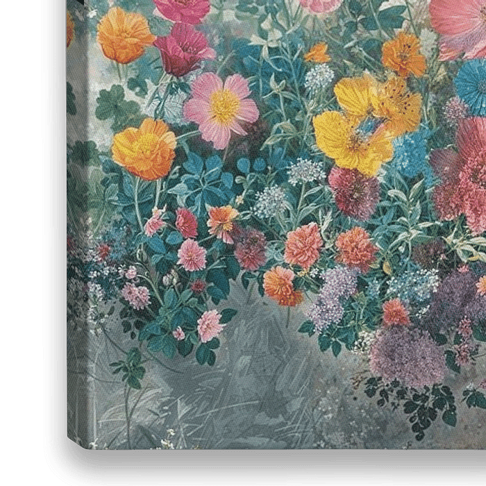 Bloementuin - Dit bloemenschilderij toont een weelderige collage van kleurrijke bloemen tegen een zacht neutraal achtergrond, waarmee een frisse en vrolijke sfeer wordt gecreëerd.