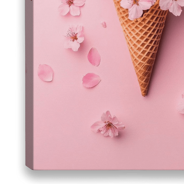 Een delicate zee van bloemen ontvouwt zich uit een knapperig ijshoorntje en bloeit op in een delicate rosé achtergrond. De zachte bloemblaadjes, als kleine kunstwerkjes uit de natuur, dansen speels rond het hoorntje en stralen een vleugje lentemagie uit. Een harmonieuze fusie van plezier en schoonheid die uitnodigt om te dromen.