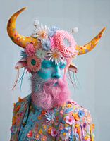 Portret met een opvallende combinatie van zowel menselijke als legendarische eigenschappen. De baard en snor in opvallend roze, terwijl de huid schittert in een opmerkelijk turquoise.